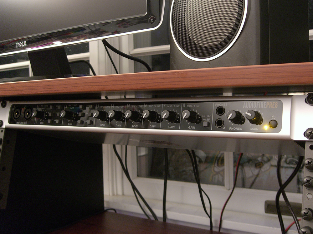 My new computer has been built and up and running for about 2 and half months now. I've overclocked it to 3.3GHz and it's been running great, and is quite the improvement over my previous laptop. Also, after being backordered for about a month, my new desk finally arrived last friday and I put it together. It has 8 rack spaces built into it for various musical equipment. My previous desk, made out of 2 old speakers and shelves, wasn't exactly "stable," and it's nice to have something I can rest my wrists on without it leaning forward. The new desk also looks a lot better and has a lot more work space. My new audio interface, the Echo Audiofire Pre8, just arrived today and I installed it in one of the rack spaces on my new desk. It sounds great, and even with a cheap condenser mic there's a night-and-day difference compared to my Blue Snowball. It has 8 preamps, 16 ins and outs, and 2 inputs with mic phase, impedance, pad, hi-pass, and DI switches. Guitars and basses sound great even with a direct in with the DI switch enabled running through an amp modeler like Guitar Rig 4. You'll get to hear some of my new work through the new interface soon. Below are some pictures of my new set up: