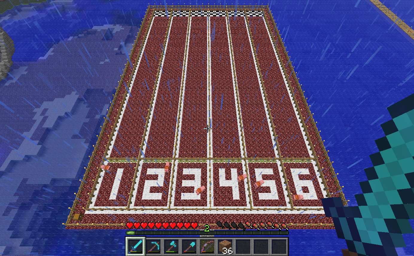 The 50m Saddled Pig Dash! Redstone is hooked up to lower all of the gates at the flick of a lever that's in gate 1. The chest is full of carrots on an stick to control the pigs with: